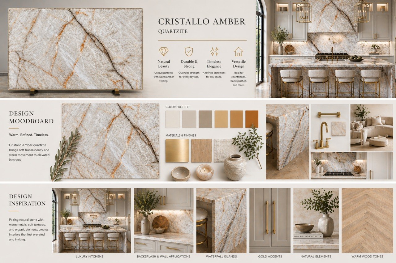 Cristallo Amber Quartzite — where light meets texture 24 April 2026 Hits: 1 Share: Warm amber veins. Soft translucency. Natural movement you can’t replicate. Designed to elevate kitchens from beautiful → unforgettable. Venezia Surfaces. Choose once. Live beautifully. Next